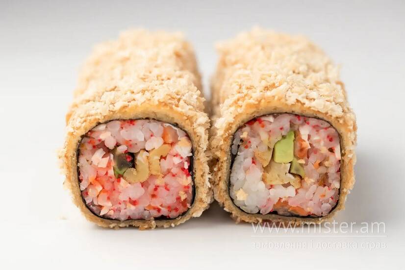 Лосось с/с, сніговий краб, авокадо, омлет томаго, ікра тобіка.