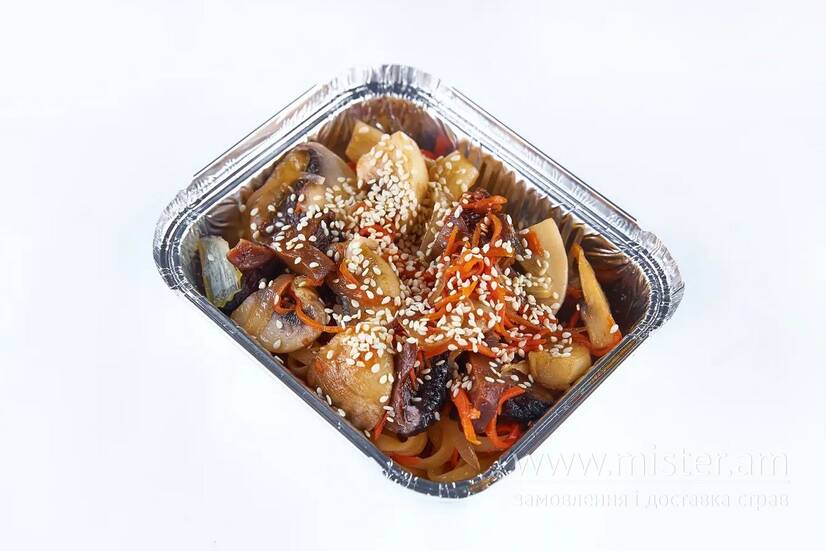 Печериці, гриби шиітаке, цибуля ріпчаста, морква, фірмова або гостра заправка.