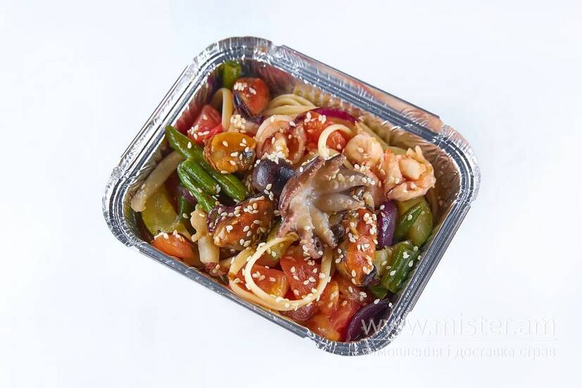 Мідії, кальмар, креветка, цукіні, помідор, стрючкова квасоля, червона цибуля, фірмова заправка.