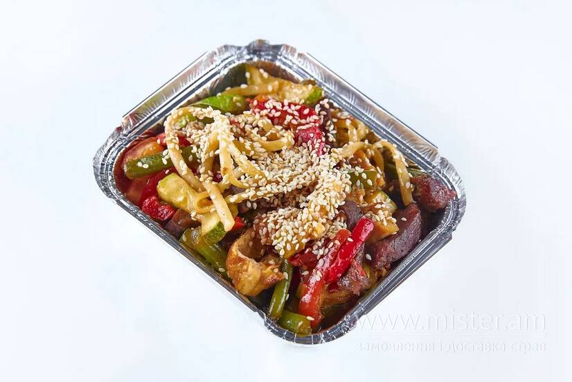 Яловичина, цукіні, перець солодкий, червона цибуля, стрючкова квасоля, помідор, омлет томаго, фірмова або гостра заправка.