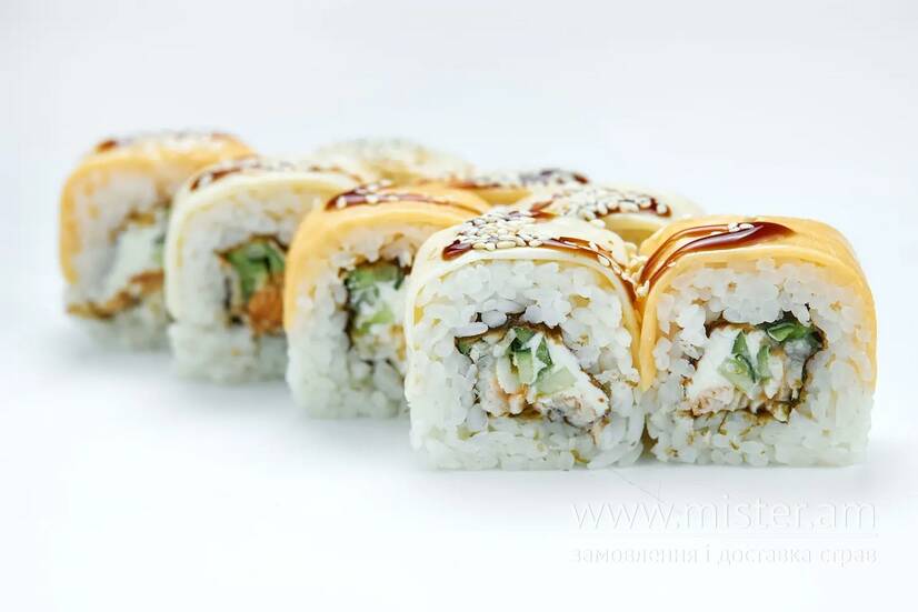 Вугор, огірок, сир вершковий, сир тостовий, соус унагі, кунжут.