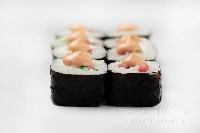 Тунець, ікра тобіка, огірок, листя салату, соус спайсі.