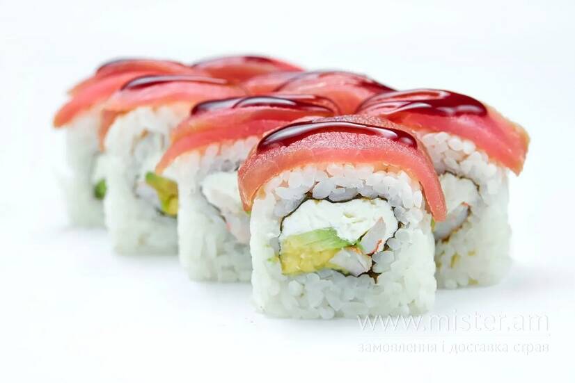Тигрова креветка, тунець, сир вершковий, авокадо.