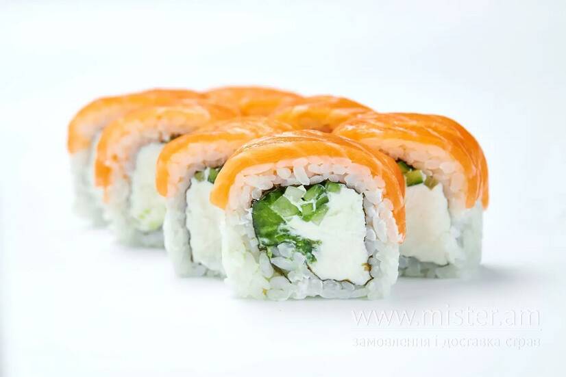 Лосось с/с, огірок, авокадо, сир вершковий.