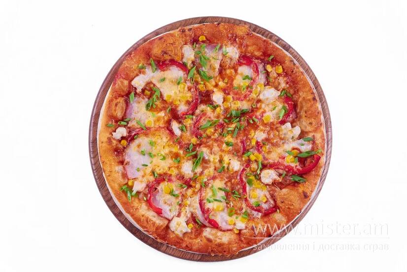 Сир, курка, балик, буженина, кукурудза консервована, перець солодкий, соус гострий.