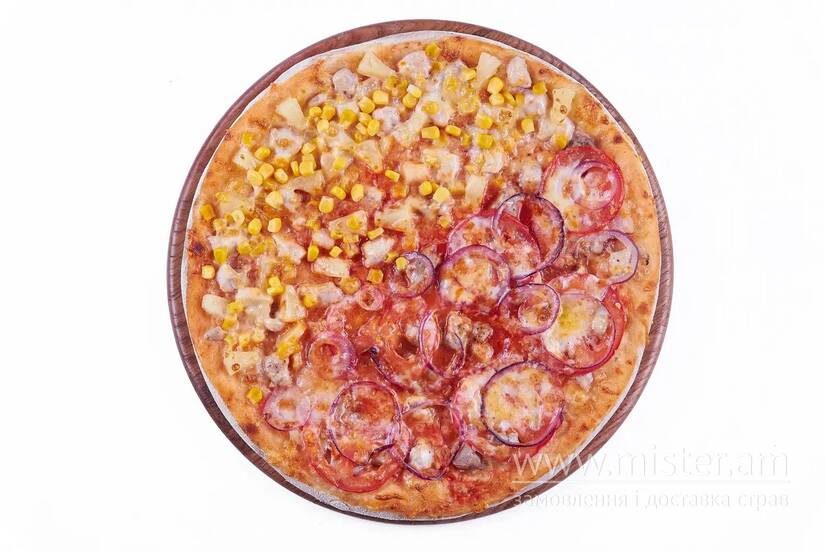 Сир, курка, свинина, телятина, бекон, цибуля червона, томати, ананас консервований, кукурудза консервована, соус томатний.