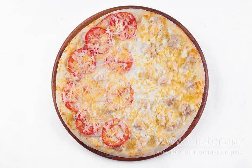 Сир, курка, бекон, томати, сир пармезан, печериці, цибуля рапчаста, соус вершковий.