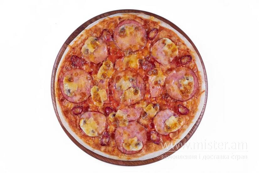 Сир, мисливські ковбаски, шинка, салямі, печериці, соус томатний.