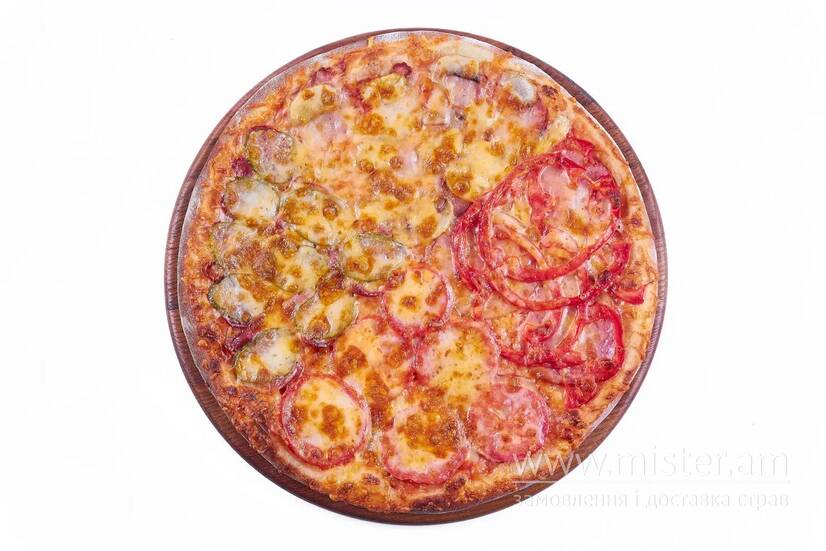 Сир, бекон, мисливські ковбаски, салямі, шинка, томати, мариновані огірки, печериці, перець солодкий, соус томатний.