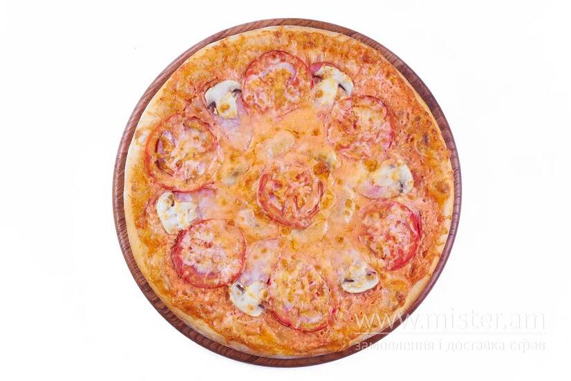 Сир, балик, шинка, томати, печериці, соус томатний.
