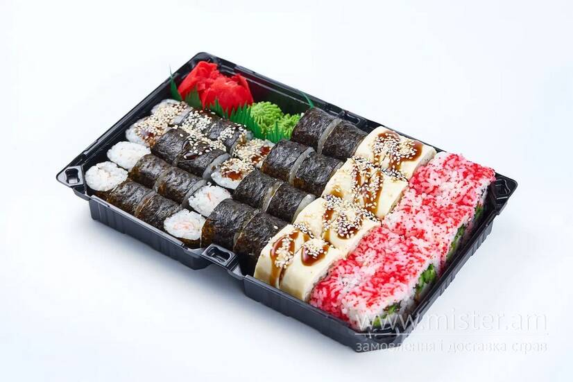 Спайсі з лососем, Каліфорнія з сиром, Чіз рол зі сніговим крабом,макі омлет, макі авокадо.