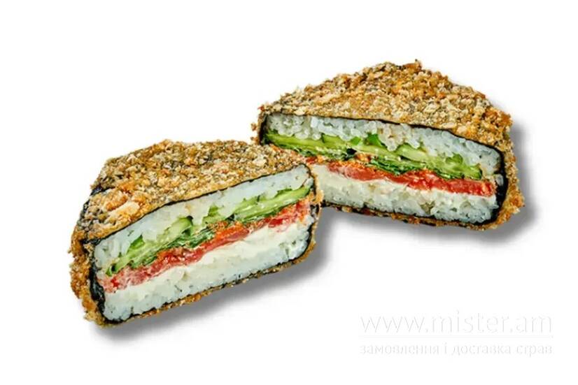 Слабосолений лосось, огірок, авокадо, сир вершковий, тобіка, листя салату.