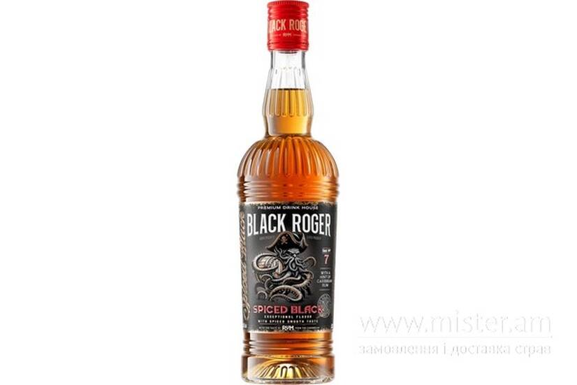 Спиртний напій з ромом Black Roger Spiced Black 0.5 л 35%. Black Roger Spiced Black — це пряний спиртний напій на основі рому міцністю 35 %, що вирізняється насиченим смаком з нотами спецій і карамелі. Ідеально підходить для вживання в чистому вигляді або як основа для коктейлів. Зручна пляшка об'ємом 0.5 л дозволяє насолодитися напоєм у компанії або в затишній атмосфері. Гарний вибір для поціновувачів пряних ромових напоїв за доступною ціною.