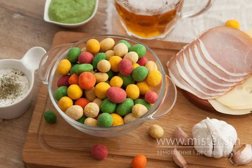 Відмінна пивна закуска! В якості основи береться бланшований арахіс меншого калібру і смажиться за особливою технологією, що дозволяє домогтися найбільш характерного смаку справжніх смажених горіхів і гармонійно поєднувати цей смак з ароматичними добавками.