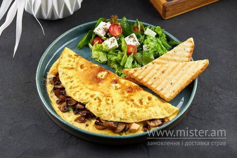 Італійський омлет фрітата з курочкою, печерицями, моцарелою, спеціями і зеленню та легкий салатний мікс з томатами черрі і сиром фіта.