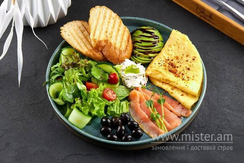 Розмаїття смаку в одній повноцінній страві. Омлет з двох яєць, хлібні тости, маслини, мікс салату з огірком в лаймовому соусі, авокадо, оливковий топенад і слабосолоний лосось.