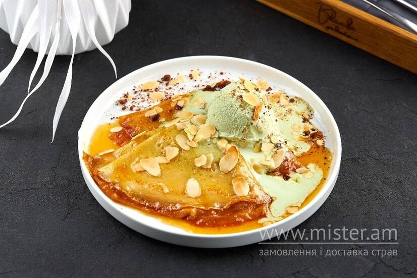 Смажені в апельсиновому соусі млинці з морозивом матча-пломбір, шоколадний крамбл і мигдалеві пластівці.