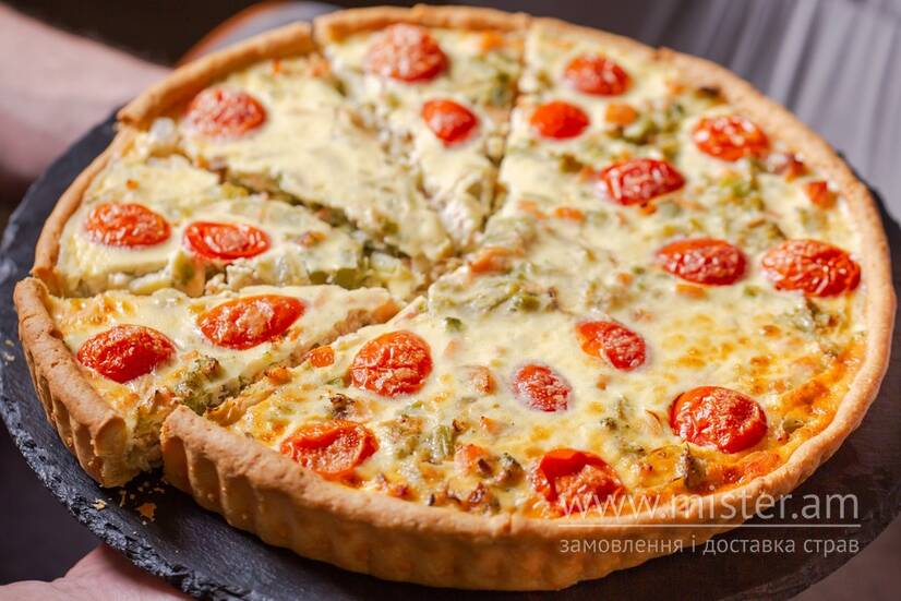 Начинка з лососем, капустою броколі, томатами черрі в корпусі з пісочного тіста, залитого сирно-вершковим соусом.