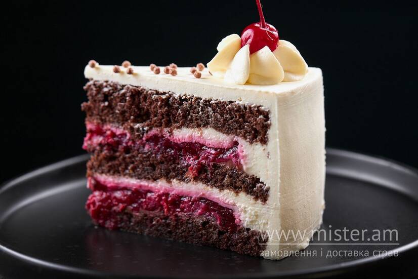 "Шварцвальд" – наше тістечко, що вам сподобається. Шоколадний бісквіт, просочений вишневим соком, вкритий ніжним кремом та прикрашений вишнями. Кожен шар цього десерту – це витончена мозаїка смаків. Ароматний шоколад, легка кислинка вишень та ніжний крем створюють неповторну гармонію. Кожен шматочок "Шварцвальду" – це смакова подорож, де ви зануритесь у таємничий світ лісового величчя та незабутніх насолод.