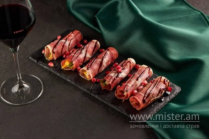 Делікатне поєднання шматочків манго і груші з м`якими сирами, гілочками груші в тонесеньких слайсах іспанського хамону в бальзамічному соусі стануть неперевершенним доповненням до вашого аперетиву.
