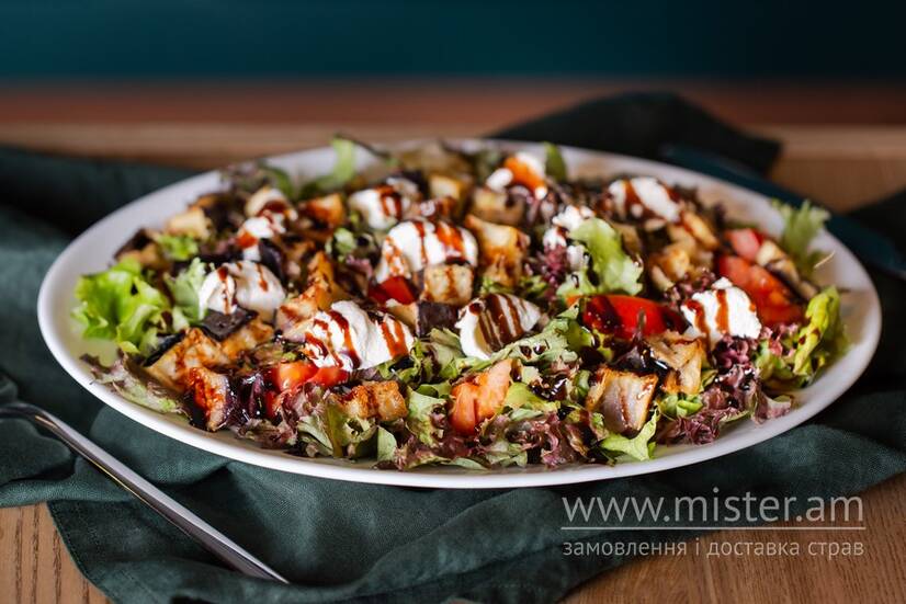 Листя салатів, смажений баклажан, томати, крем-сир, бальзамічний крем, оливкова олія.
