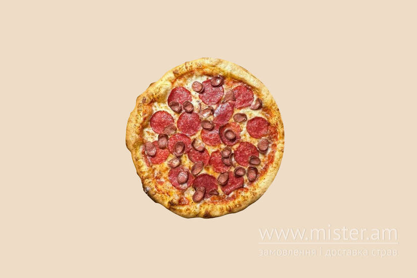 Соус томатний, салямі, моцарела, єгерські сосиски.