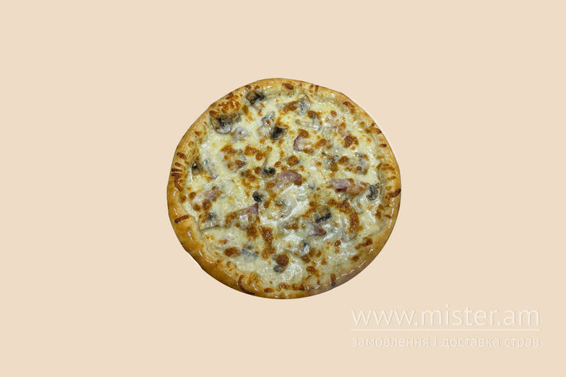 Соус вершковий, бекон, гриби, моцарела, пармезан.