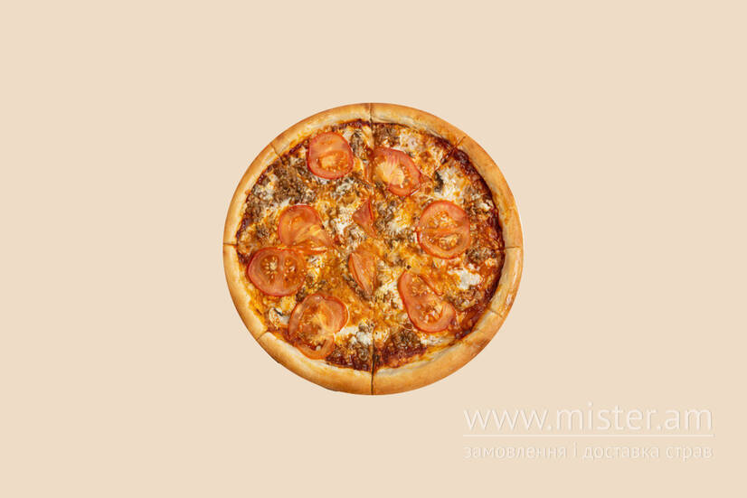 Соус томатний, помідори, тунець, моцарела, цибуля маринована.