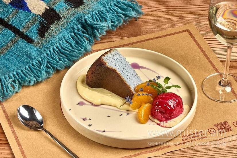 Ніжний лавандовий чизкейк із тонким квітковим ароматом, доповнений освіжаючим кремом юдзу. Подається з яскравим кизиловим сорбе та маринованими мандаринами, що додають десерту цитрусової свіжості та балансу. Вишуканий десерт із гармонійним поєднанням текстур і смаків.