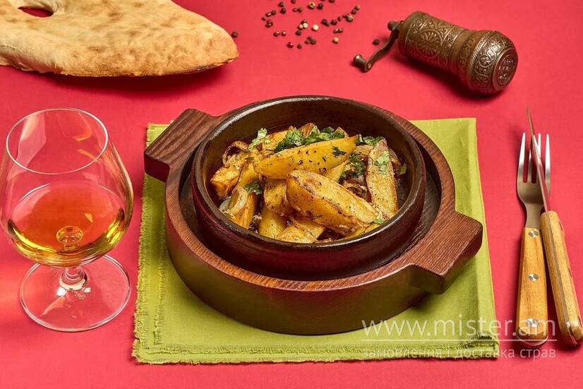 Картопля обсмажена до рум`яної скоринки з цибулею та ароматними сванськими спеціями.