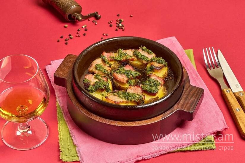 Запечена картопля із соковитими шматочками підчеревини, приправлена духмяними спеціями.