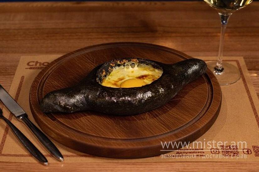 Ексклюзивна чорна інтерпретація легендарного хачапурі по-аджарськи — ароматне тісто з натуральним чорнилом каракатиці з крафтовою бринзою, сулугуні та яйцем.
