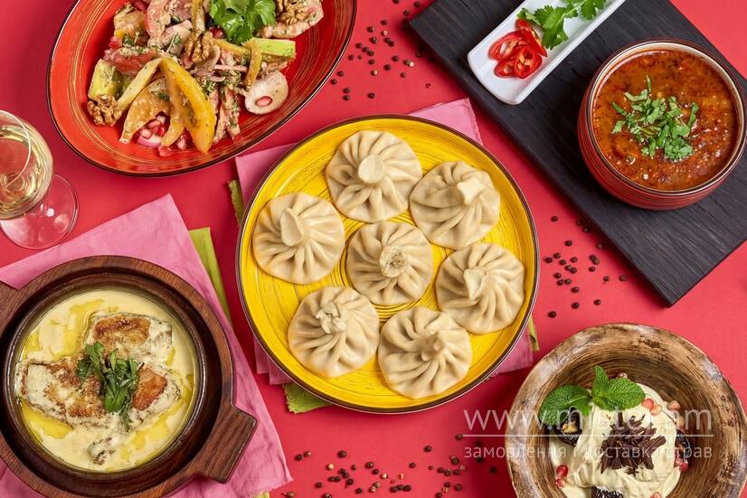 Салат Грузинський по-домашньому, суп харчо, чкмерулі з курки, хінкалі свино-яловичі 3 шт., чорнослив з горіхами та вершковим соусом. *Фото є прикладом подачі та може відрізнятись.