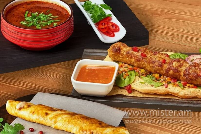 Суп харчо класичний, кебаб курячий, хачапурі на мангалі. *Фото є прикладом подачі та може відрізнятись.