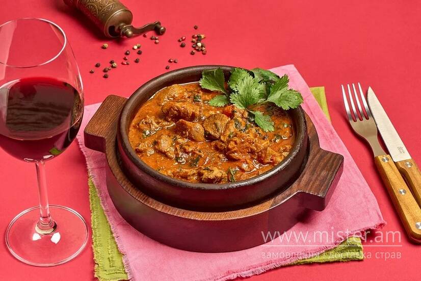 Ніжна молода телятина, тушкована з цибулею, томатами, зеленню, часником і грузинськими спеціями.
