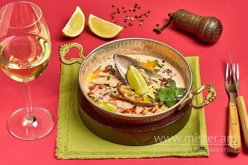 Ніжний суп на основі морепродуктів із характерною лимонно-яєчною текстурою, східними спеціями та легкою кислинкою.