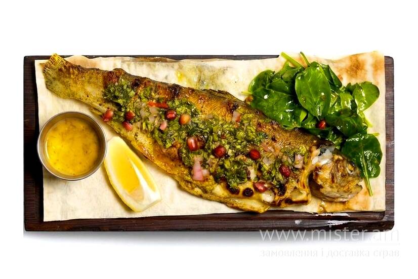 Обсмажена на вугіллі до хрумкої скоринки річкова форель із зеленим ткемалі та чимічурі.
