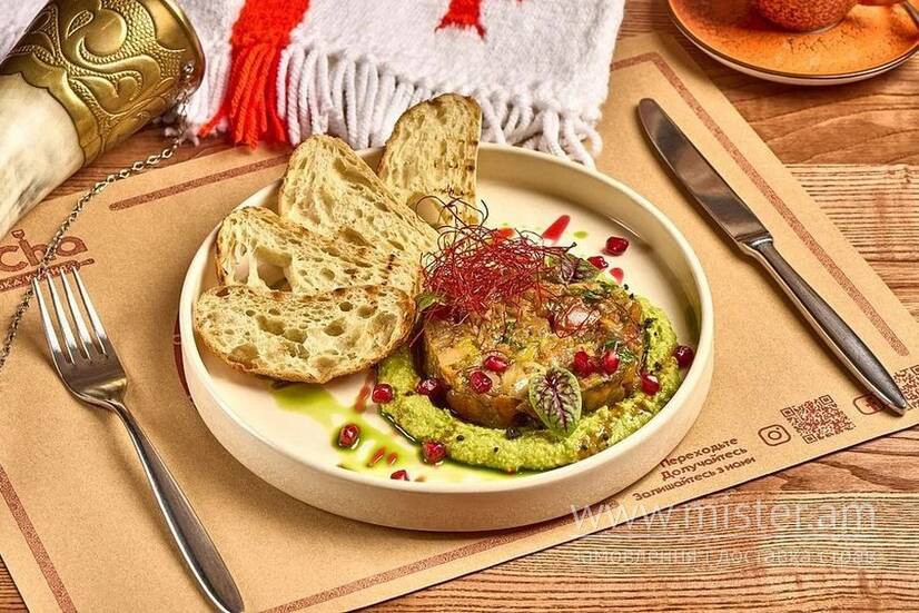 Ароматні запечені овочі, що доповнюють ніжний хумус із зеленого горошку, подаються із хрусткою підсмаженою чіабатою.