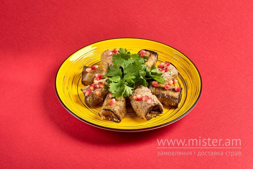 Рулетики з смаженого баклажану з начинкою із молодих горіхів, кінзою, часником та спеціями.