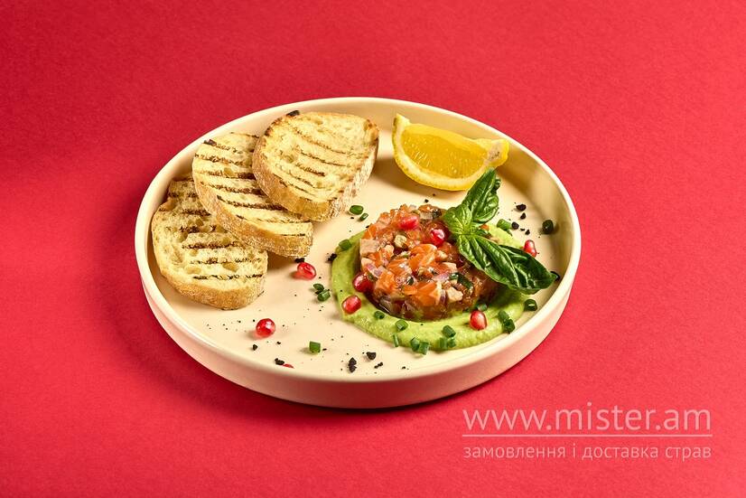 Заправлений грузинськими спеціями та поданий із мусом гуакамоле й хрусткими тостами.