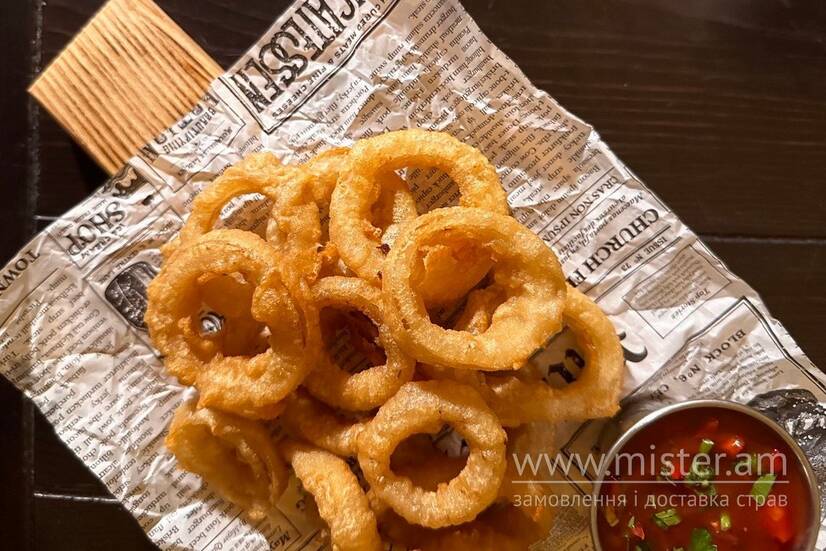 Цибулеві кільця в пивному клярі, подаються з томатно-овочевим соусом.