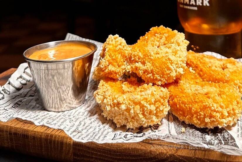 Калямар в сухарях фрі, соус кисло-солодкий.