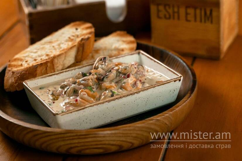 М`ясо мідій, вершки, цибуля марс, часник, біле вино, петрушка. Подаються з грінками.