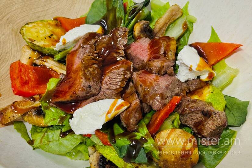 Мікс зелені, овочі обсмажені на грилі (кабачок, перець болгарський, печериці), ростбіф з телячої філейної частини, ніжний вершковий сир, соус Теріякі та свит чілі.