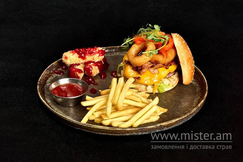Чікен чедер бургер, сирні палички, журавлинний соус, картопля фрі, кетчуп, кока-кола ж/б.