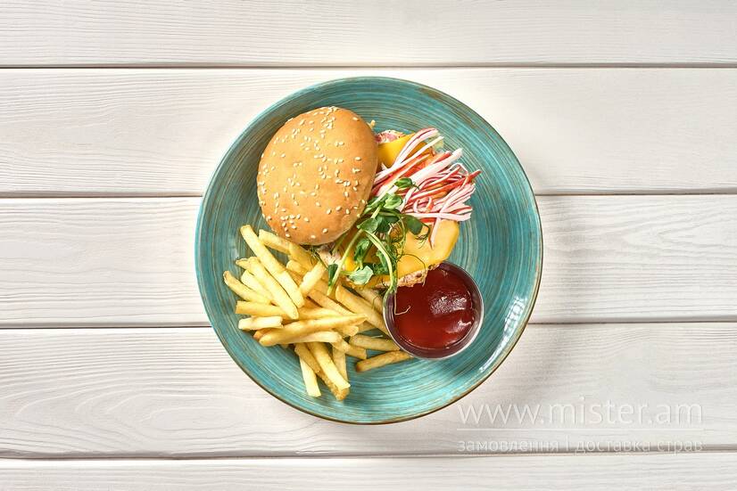 Крабс-котлета, кукурудзяний соус, свіжий огірок, помідор, айсберг, сир чедер, айолі, картопля фрі, мікрогрін та кетчуп.
