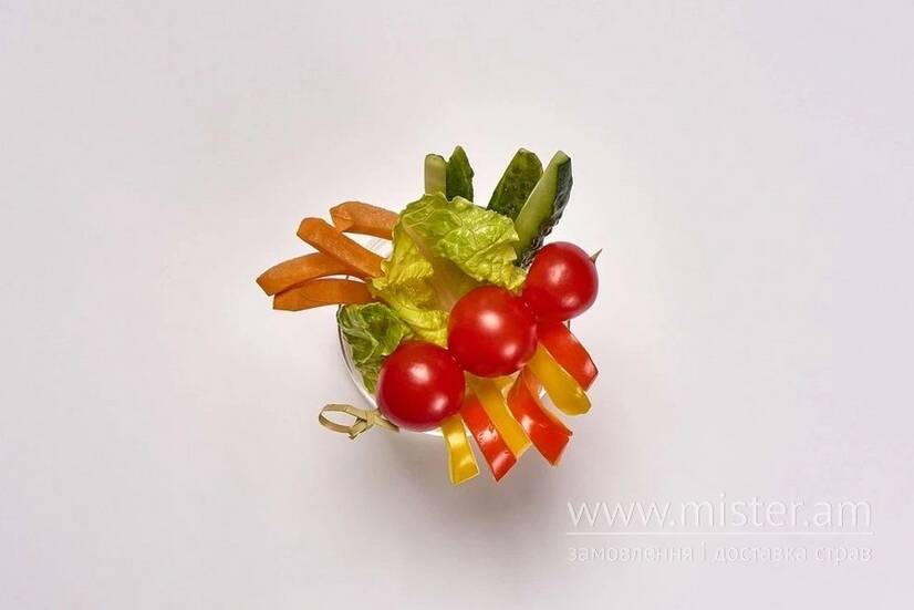 Огірок, солодкий перець, морква, помідор чері, салат ромен.