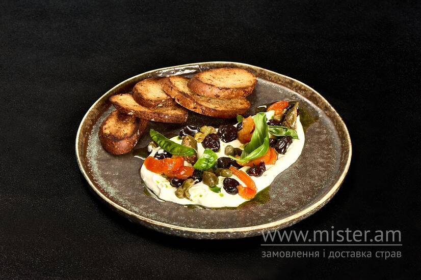 Сир лабне з в`яленими маслинами, каперсами та томатами