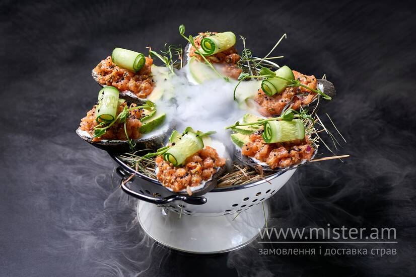 Тартар з лосося, заправка бальзамічна з каперсами, сир Філадельфія, огірок, чорний багет.