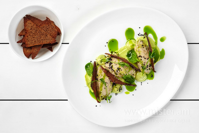 Оселедець, крекер, цибуля, сир, яйце, вершкове масло зі шпинатом.